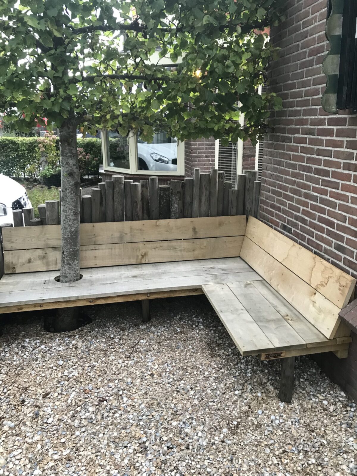Wie Sie unten auf den Bildern sehen, ist es dann auch kein Problem, wenn ein Baum im Weg steht. Den können Sie einfach in Ihre Sitzbank integrieren. Unser Kunde hat für die Sitzfläche und Rückenlehne Holzbretter aus Edelkastanie verwendet. Als Beine dienen der Bank Holzpfähle aus Edelkastanie.
