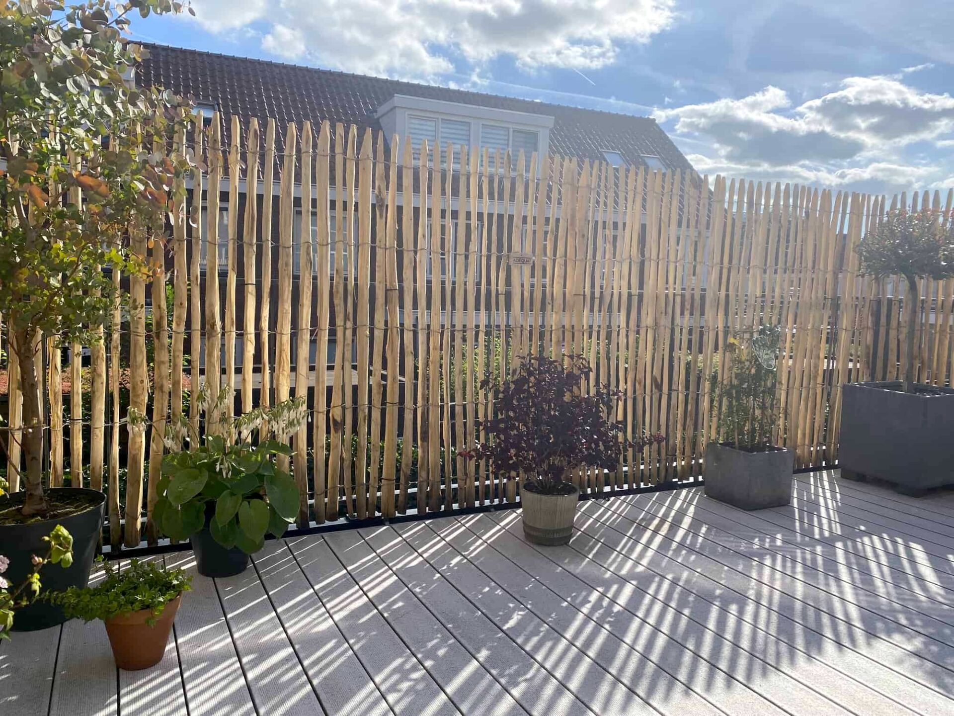Der Staketenzaun aus Edelkastanie ist ein romantischer Zaun im Landhausstil, der bei engem Lattenabstand gleichzeitig Sichtschutz bietet. Wenn Sie einen kleinen Lattenabstand von nur 2 cm wählen, erhalten Sie eine licht- und winddurchlässigen Sichtschutz aus Holz im romantischen Landhaus-Stil, bei dem Sie nicht das Gefühl haben, hinter einer „Wand“ zu sitzen. Für einen zuverlässigen Sichtschutz empfehlen wir einen Staketenzaun in 175 cm oder 200 cm Höhe.