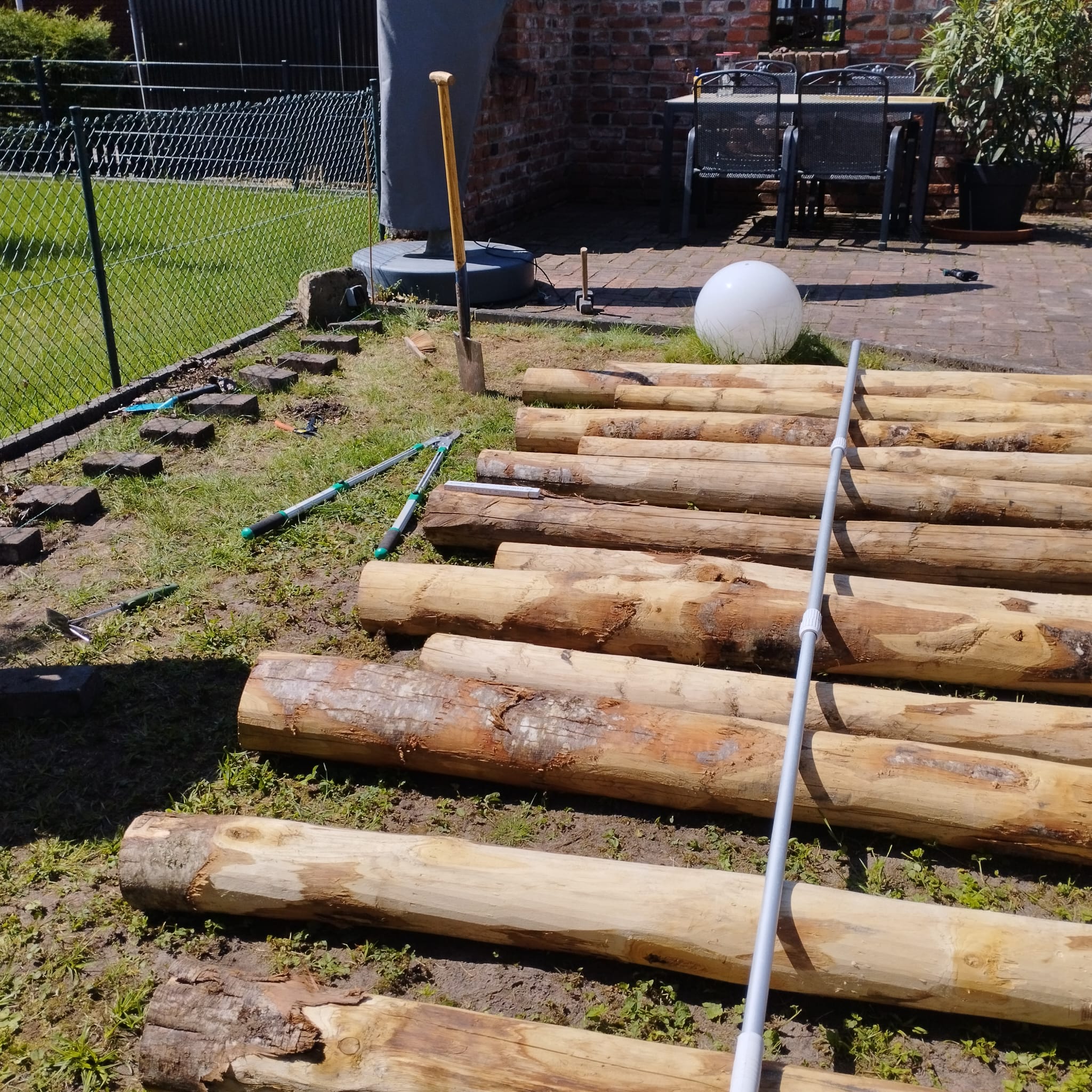 Wir haben uns ein Aussensauna gebaut. Für die Außendusche und den Sichtschutz habe ich mir bei euch die geschälten Robinienpfähle bestellt. Die habe ich geschliffen und einbetoniert. Dann habe ich von euch die Sichtschutzelemente genommen. Ist echt toll geworden und mal ganz was anderes. Vielen Dank und liebe Grüße