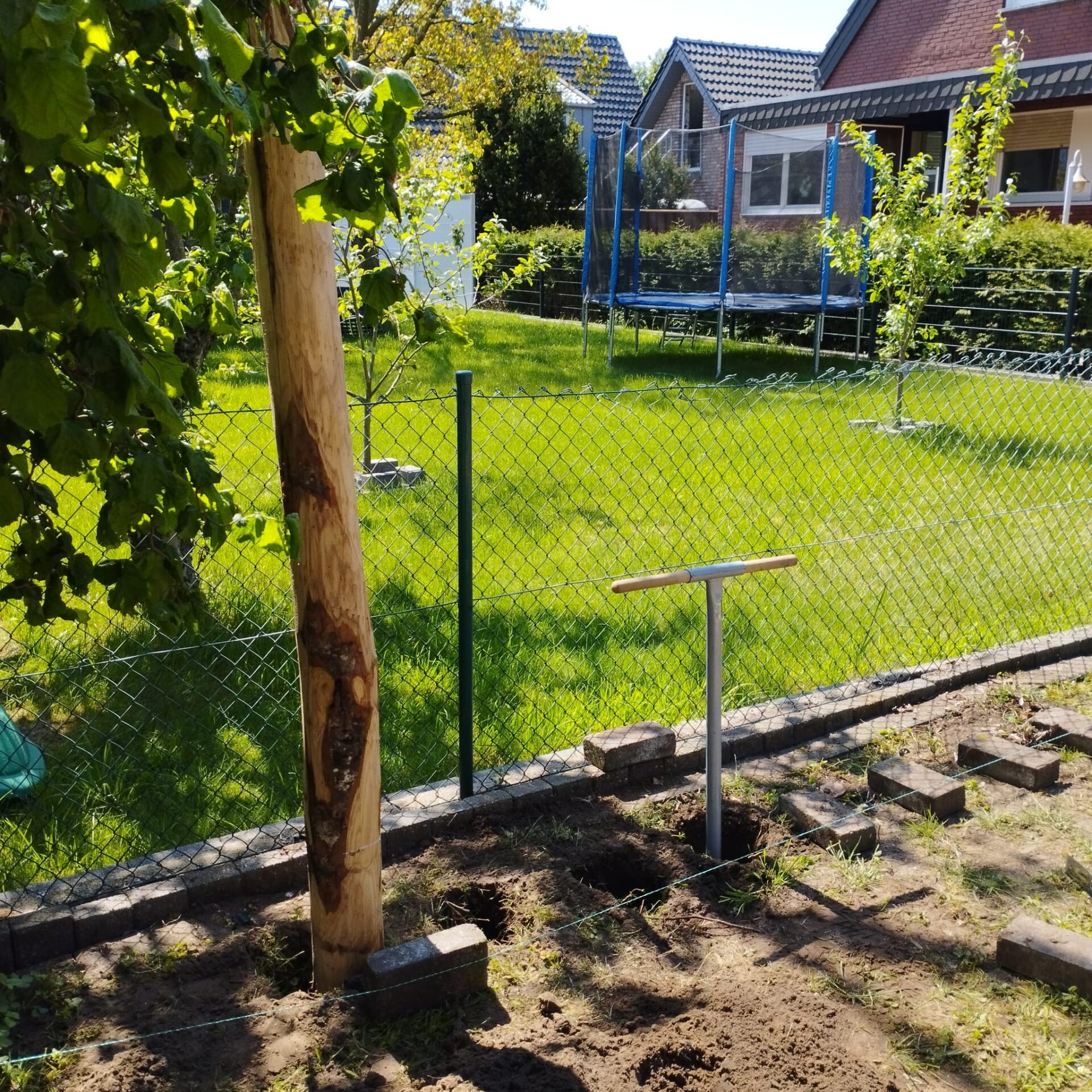 Er entschied sich für einen 100 cm hohen Staketenzaun aus Edelkastanie, den er an unseren Zaunpfählen mit Einschlaghülse befestigt hat. Mit der Einschlaghülse lassen sich die Pfähle sehr einfach und mit weniger Aufwand in den Boden einschlagen, ohne dass Sie ein Loch für den Zaunpfahl vorbereiten müssen.