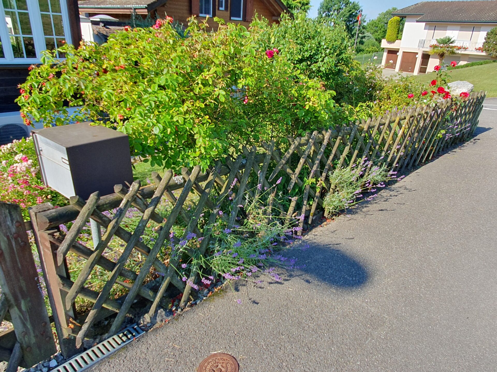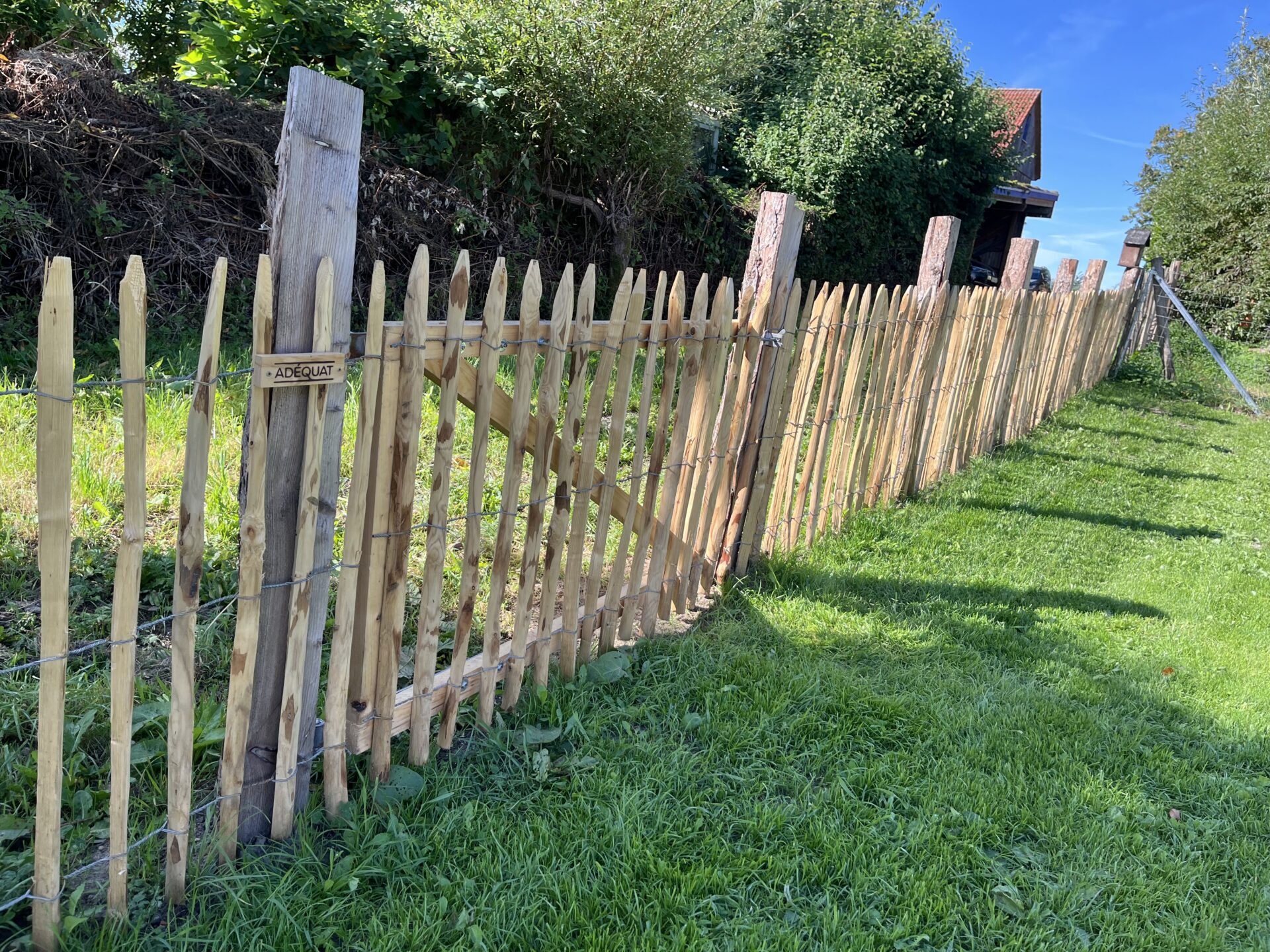 Aus einem alten Maschendrahtzaun wurde dieser schöne Staketenzaun welcher sich viel schöner in die Landschaft integriert.