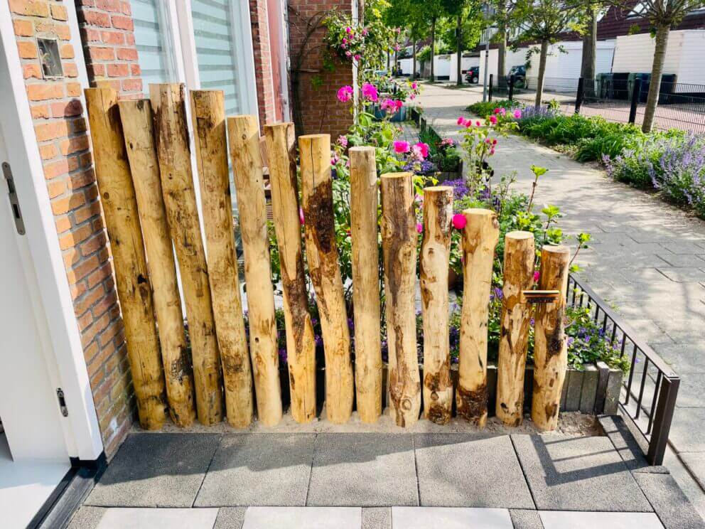 Eine Möglichkeit, einen schönen Windschutz aus Holz seitlich an der Haustür anzubringen ist die Verwendung von Holzpfählen. Damit sorgen Sie für einen besonders natürlichen Look!