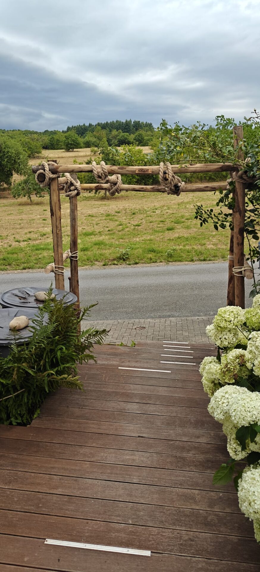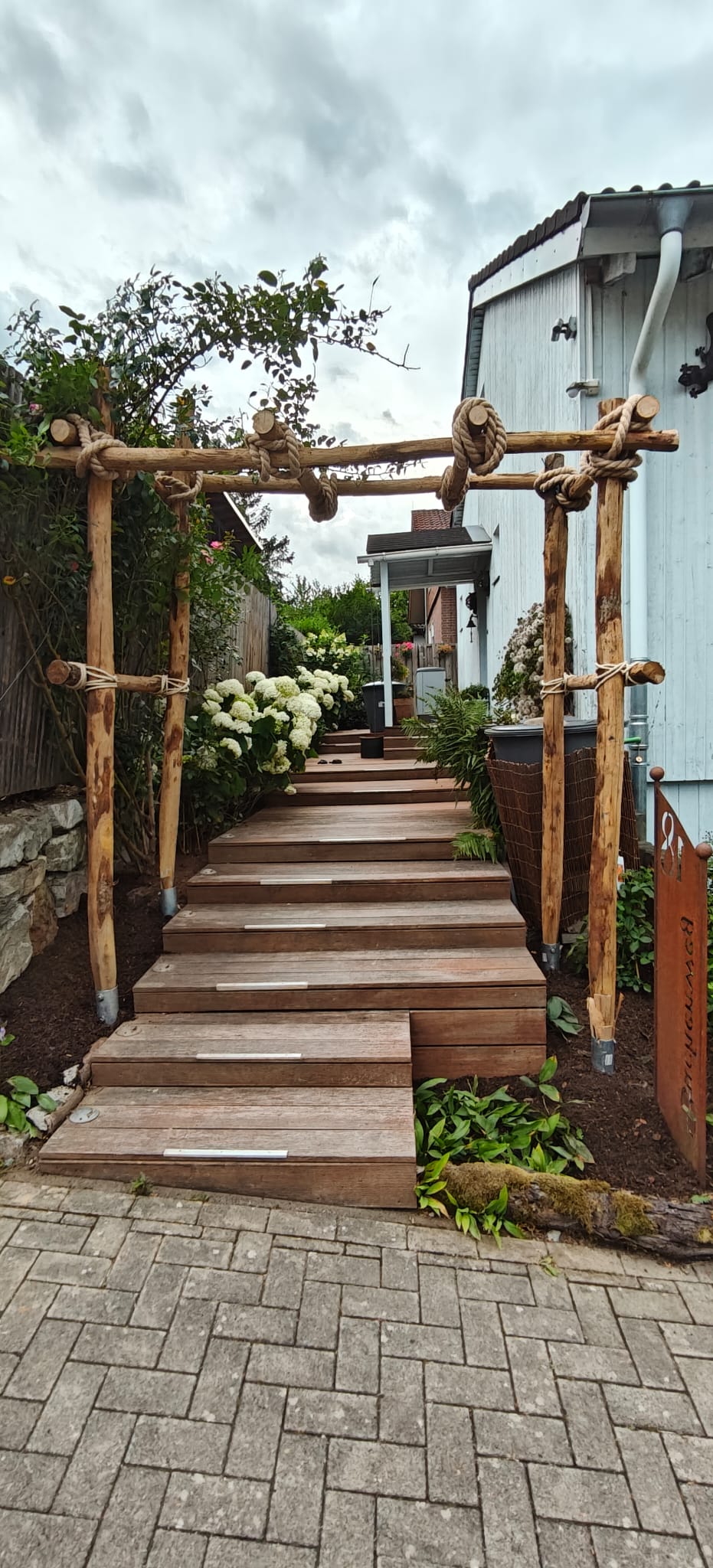 Hier sind die Fotos von seinem Rosenbogen aus Holz im Sommer 2024: