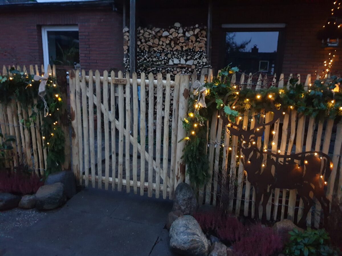 Insgesamt haben wir ca. 25 Meter Staketenzaun (1,20 Meter hoch, Lattenabstand 8 cm) mit einem 3 Meter breiten Doppeltor. So komme ich auch noch mit dem Auto in den Garten, wenn es mal sein muss.
