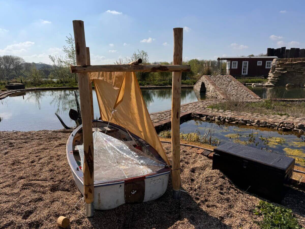 Wir haben aus dem Holz eine Konstruktion für das Sonnensegel des aus einem Boot bestehenden Sandkastens für unsere Enkel gebaut.