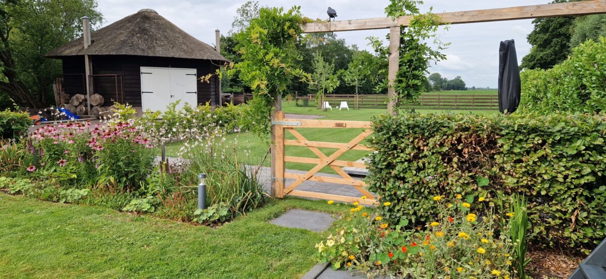 Sie schauen auf die Vorderseite, die sogenannte ’schöne‘ Seite. Das ist die Seite, auf der die Latten angebracht sind. Der Torriegel (der Verschluss des Tors) befindet sich auf der Rückseite. Standardmäßig öffnen sich unsere Tore nach rechts vom Körper weg. Gern fertigen wir auch linksdrehende Tore an.