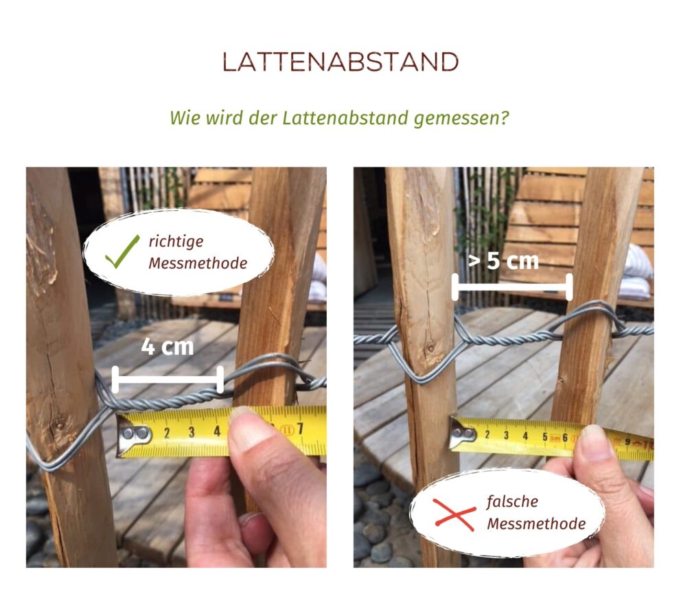 Vielleicht haben Sie schon einmal die Bezeichnung „ca. 4-5 cm Lattenabstand“ gesehen. Das liegt an der Messmethode. Wie sie in den Bildern oben sehen können, messen wir von Anfang der Drahtwicklung bis zum Ende der Drahtwicklung. Das heißt, dass die Zaunlatten tatsächlich etwas weiter auseinander stehen (5 cm). Da die Latten aus Kastanie gespalten und daher unregelmäßig sind, handelt es sich um eine circa-Angabe.
