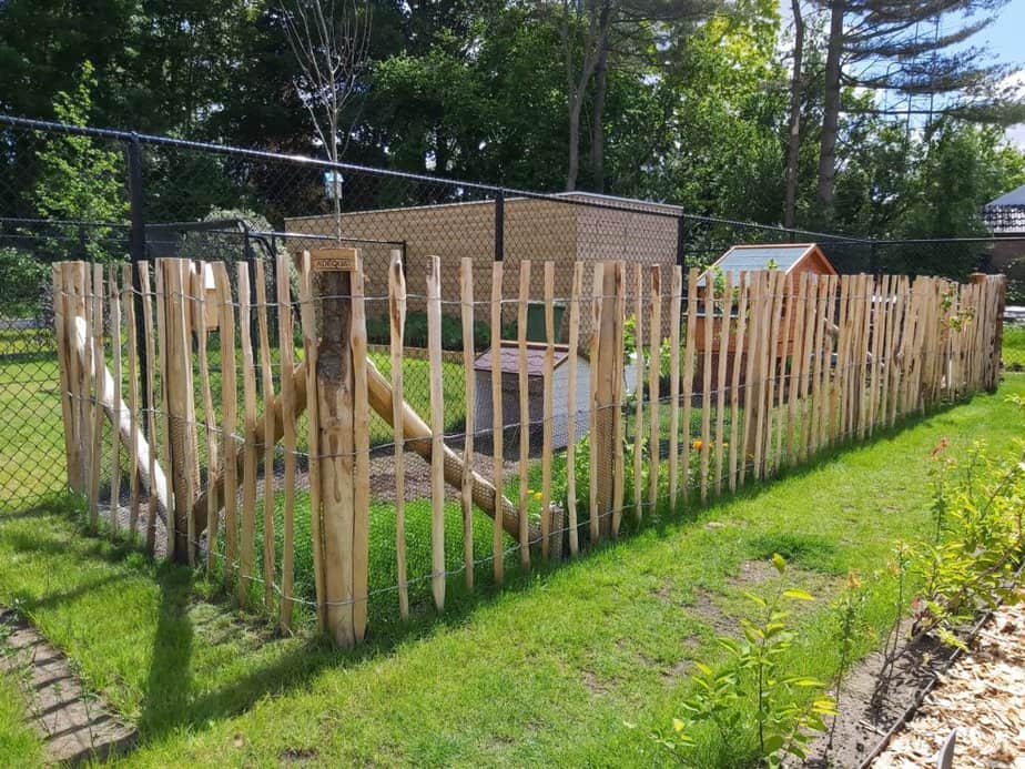 Daher eignen sich diese Zäune besonders gut für die Tierhaltung. Denn mit einem weiten Lattenabstand können Sie die Tiere besonders gut sehen. Wenn Sie 10 cm Lattenabstand für ein Kleintiergehege wählen, also beispielsweise für ein Kaninchen oder Hühner, dann empfehlen wir, hinter dem Staketenzaun unten zusätzlich einen kleinen Drahtzaun (Sechseckgeflecht für Kleintiere) anzubringen.