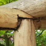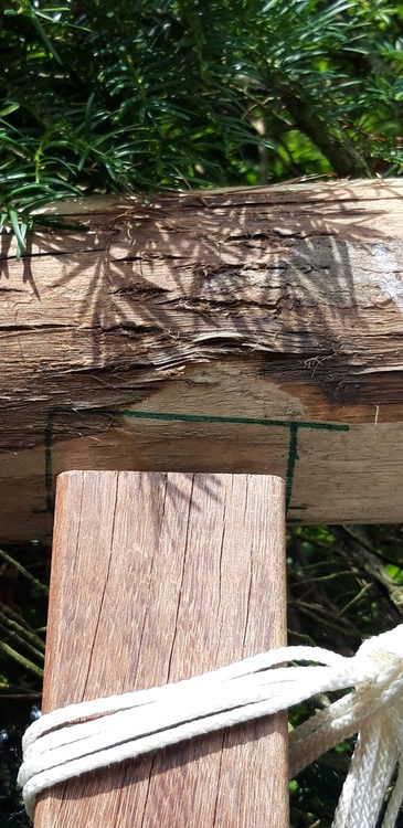 Si la pergola doit être fixée à une clôture existante ou à la maison, vous pouvez procéder comme suit : placez la poutre à l’endroit souhaité et marquez l’endroit où elle sera placée sur le montant. Vous pouvez utiliser une corde pour maintenir le poteau en place. Bastiaan a ensuite utilisé une perceuse et un ciseau à bois pour faire l’entaille de manière à ce que la poutre s’adapte parfaitement au montant. Il s’agit d’un travail précis et laborieux plus facile à réaliser si vous êtes assis face au poteau placé sur des tréteaux.