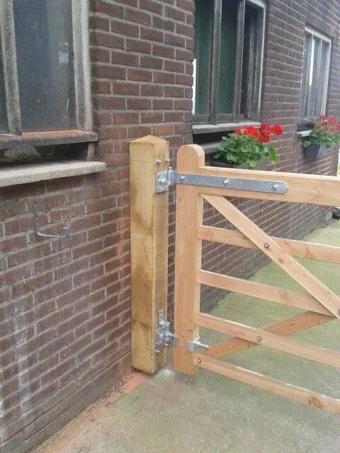 Il est essentiel de choisir des poteaux carrés de 20 x 20 cm avec une tête en diamant. Sans ces dimensions, il n’est pas possible d’installer le mécanisme de la porte pivotante.