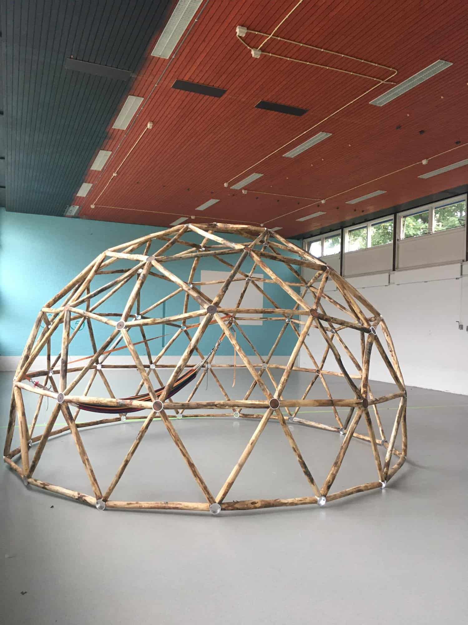 Hieronder ziet u een kastanjehouten geodome ingezet als landart project “Sunspace” door De Wilde Studio waarbij de waarnemer zich meer bewust wordt van zijn relatie met de Zon.