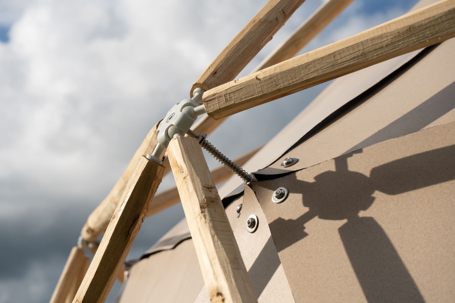 Afhankelijk van de gekozen diameter van de geodome (meestal 3 of 4 meter) ontvangt u latten van verschillende lengtes. Daarna hoeft u ze alleen nog maar met de geleverde verbindingsstukken in elkaar te zetten, stap voor stap ontstaat zo een prachtige houten koepel!