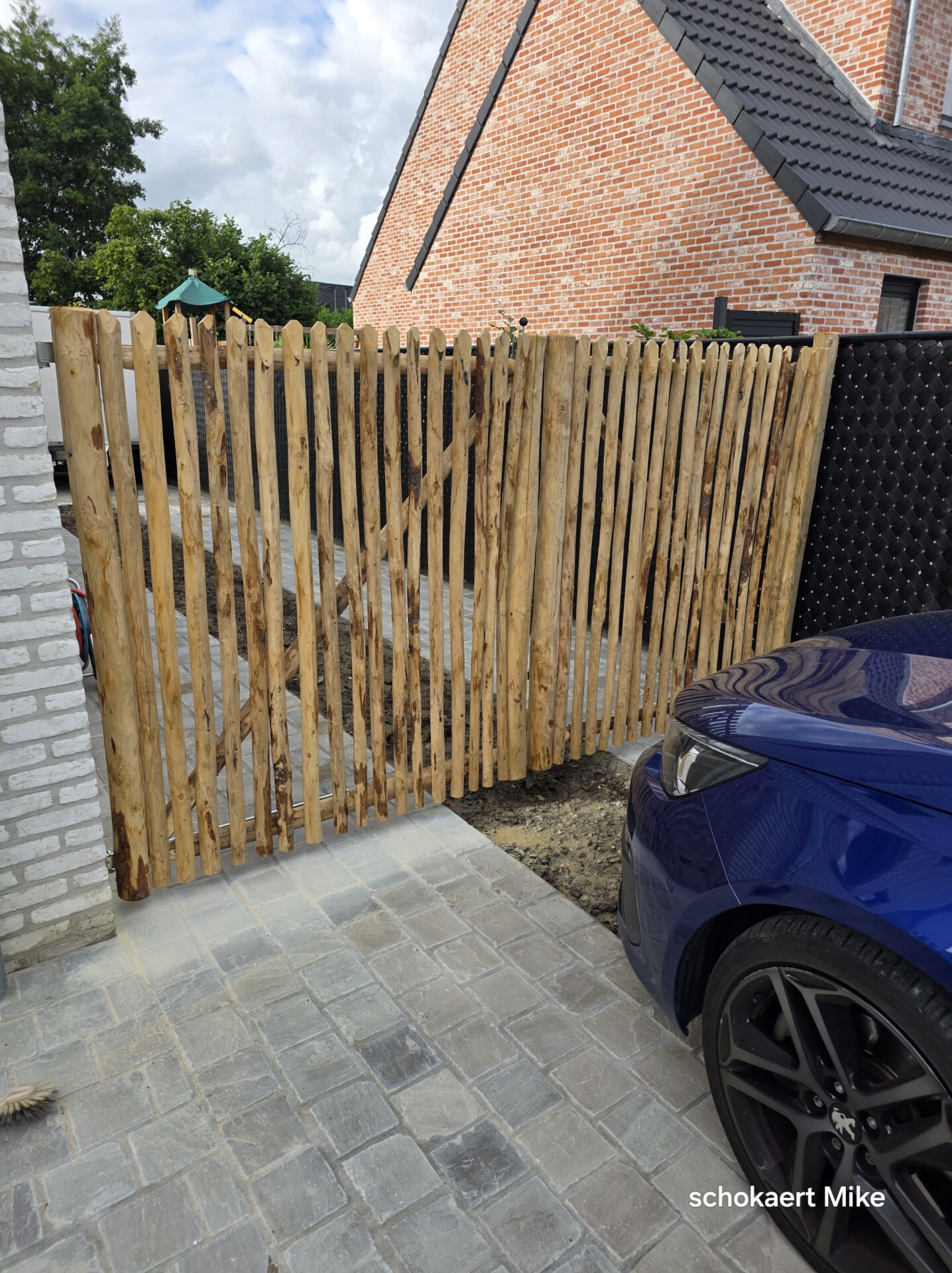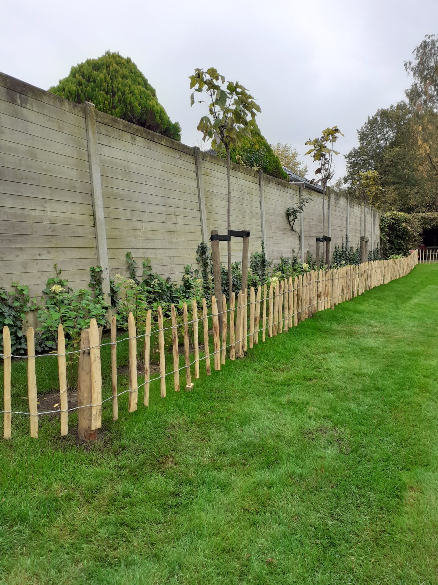 We zijn erg blij te horen dat een klant zijn vrouw helemaal gelukkig heeft gemaakt met een tuinscherm van kastanjepalen. Hiervoor zijn kastanje palen met een diameter van 10 tot 12 centimeter in lengtes 150/160 en 175 centimeter gebruikt. Kastanjehouten palen hebben een grote decoratieve waarde en kunnen uw achtertuin helemaal afmaken. Ze zijn natuurlijk ook functioneel: u kunt er hoekjes mee creëren of ongewenste elementen in uw tuin eenvoudig afschermen.