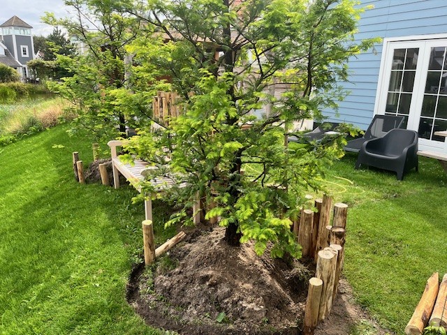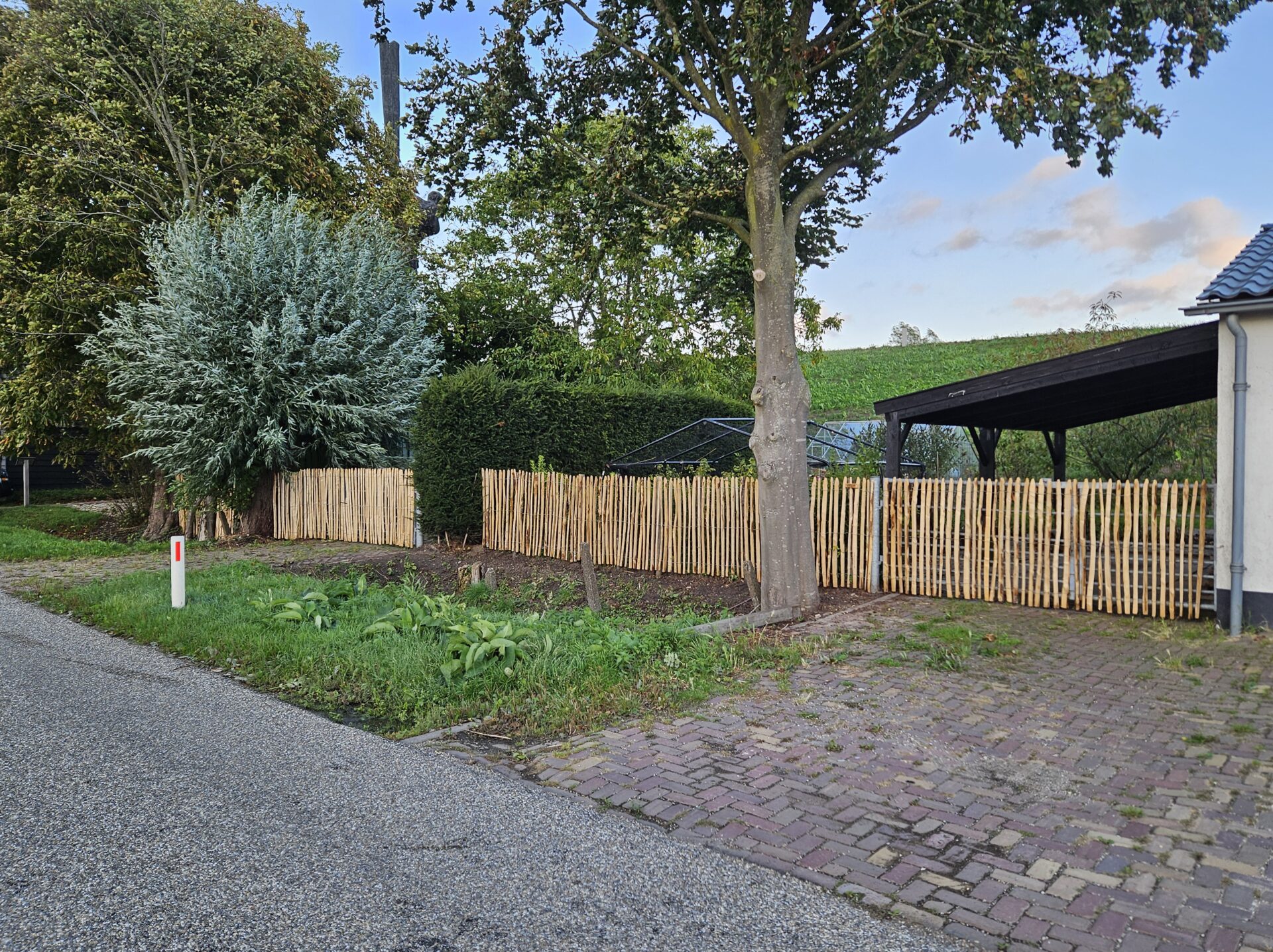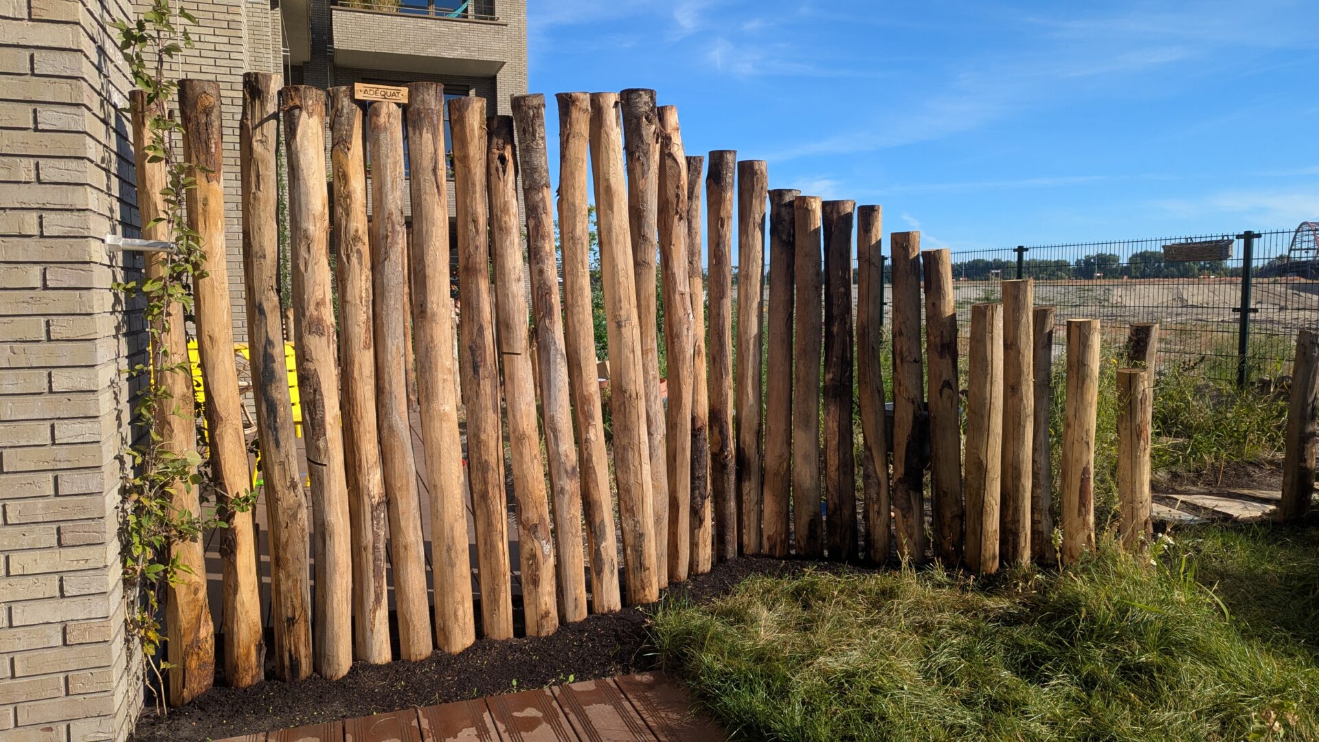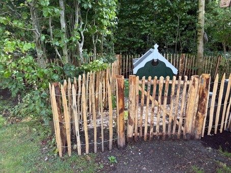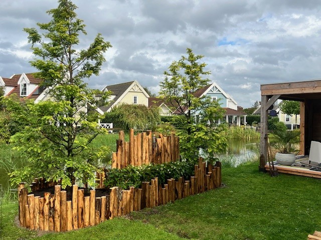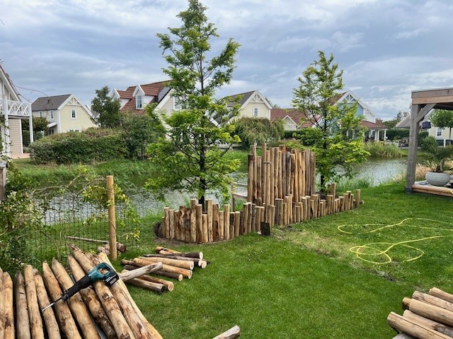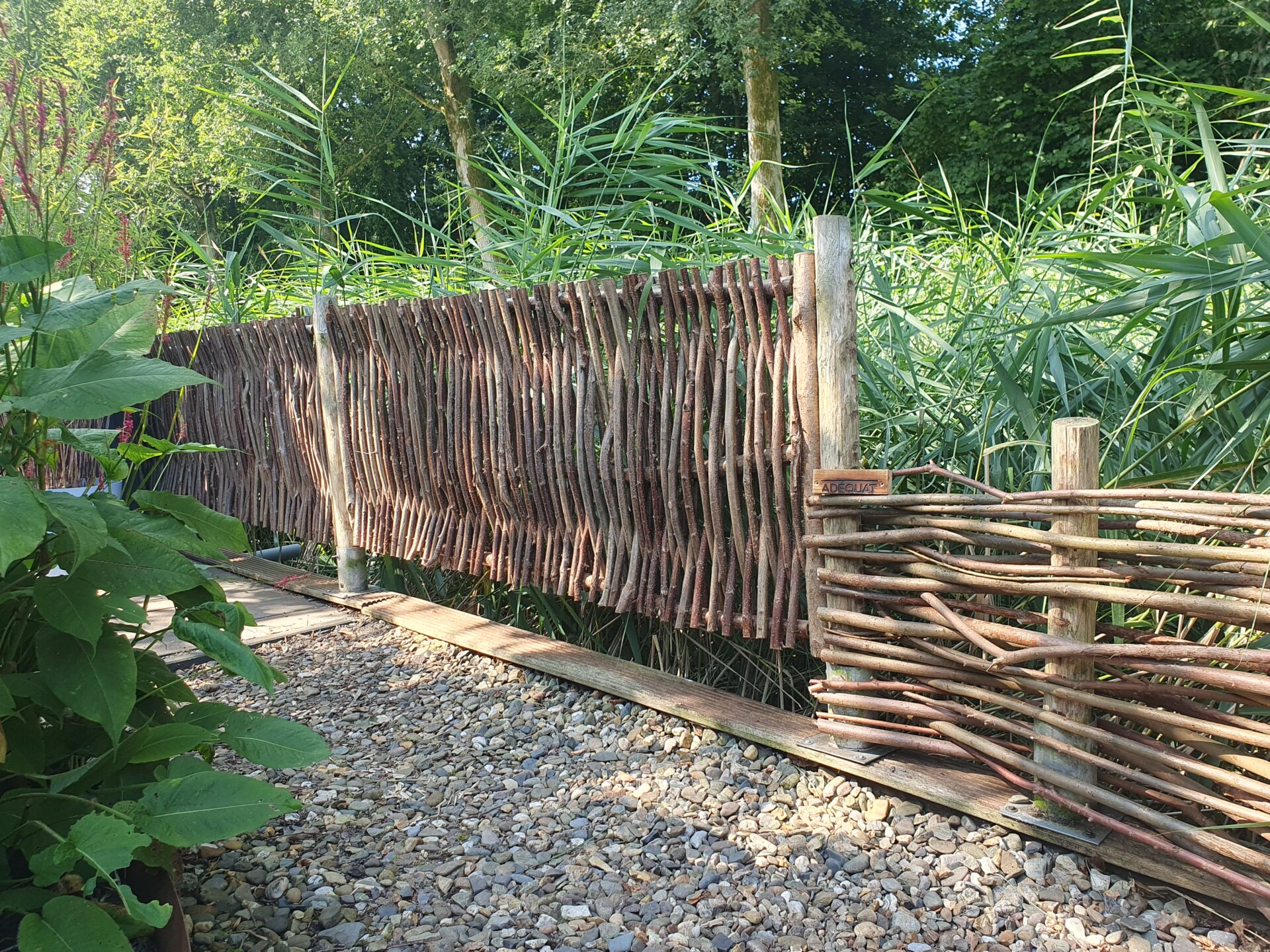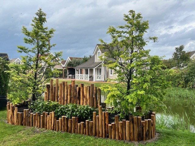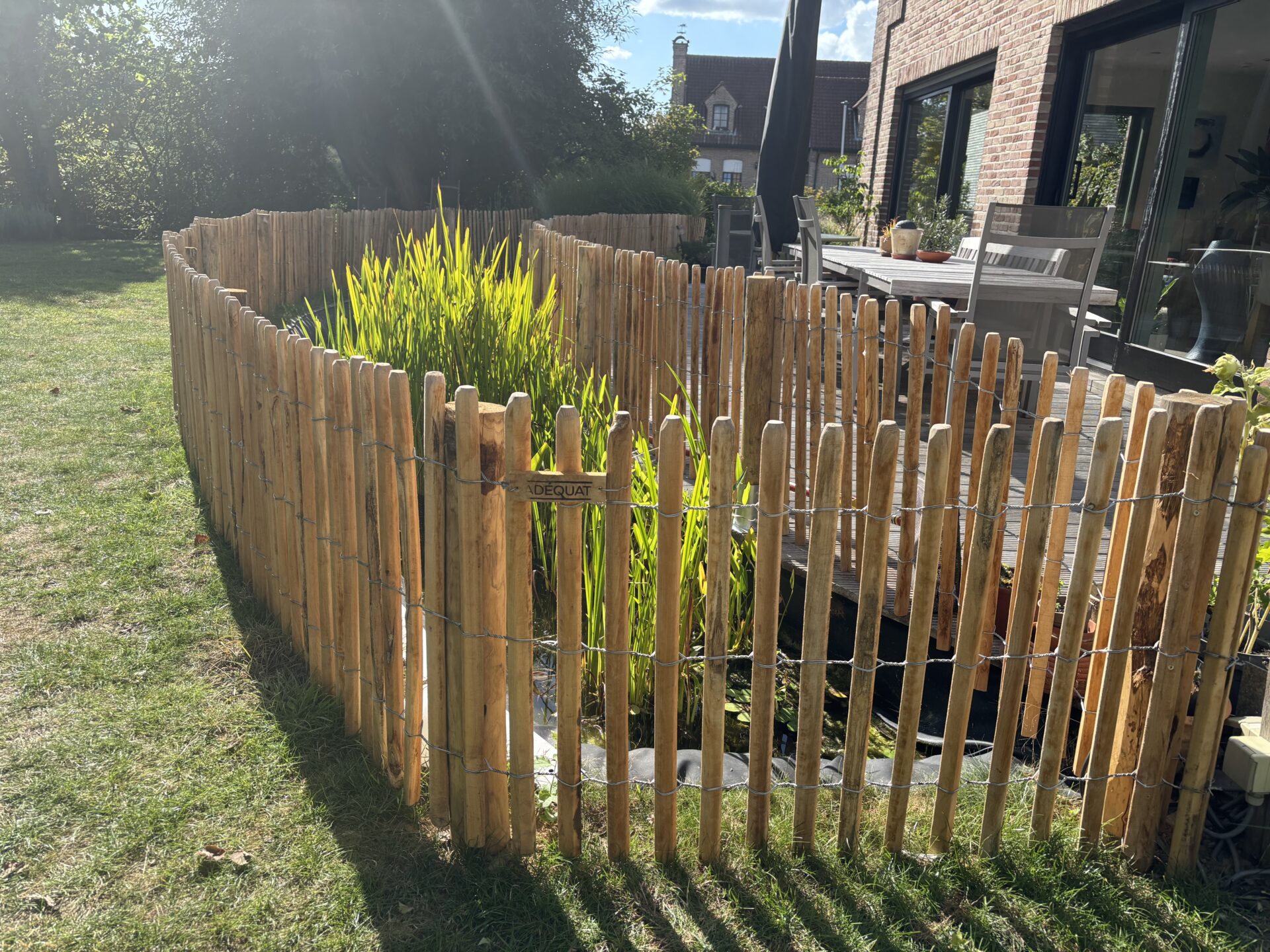 De winnaar van deze maand is voor de combinatie van veiligheid en een prachtige uitstraling gegaan. Deze vijver heeft namelijk een omheining van ons robinia schapenhek geschuurd, 80 centimeter hoog. De latafstand is 4 centimeter, dat is ideaal om de vijver nog goed te zien, maar wel hoog genoeg om bescherming te bieden. Bij het hekwerk zijn kastanjepalen van 150/160 centimeter lang toegevoegd.