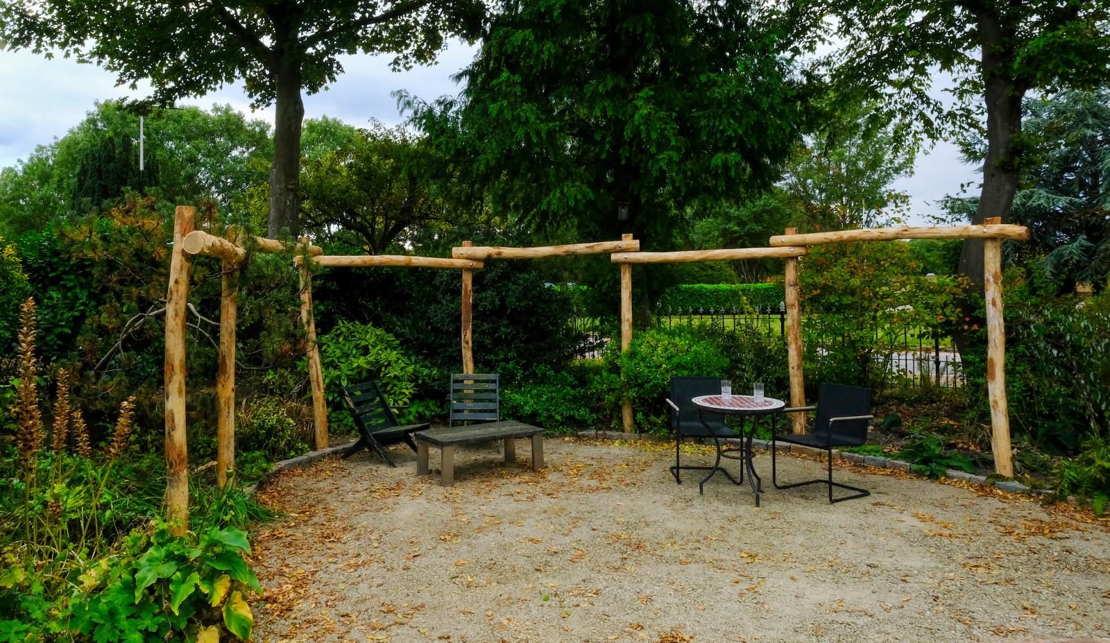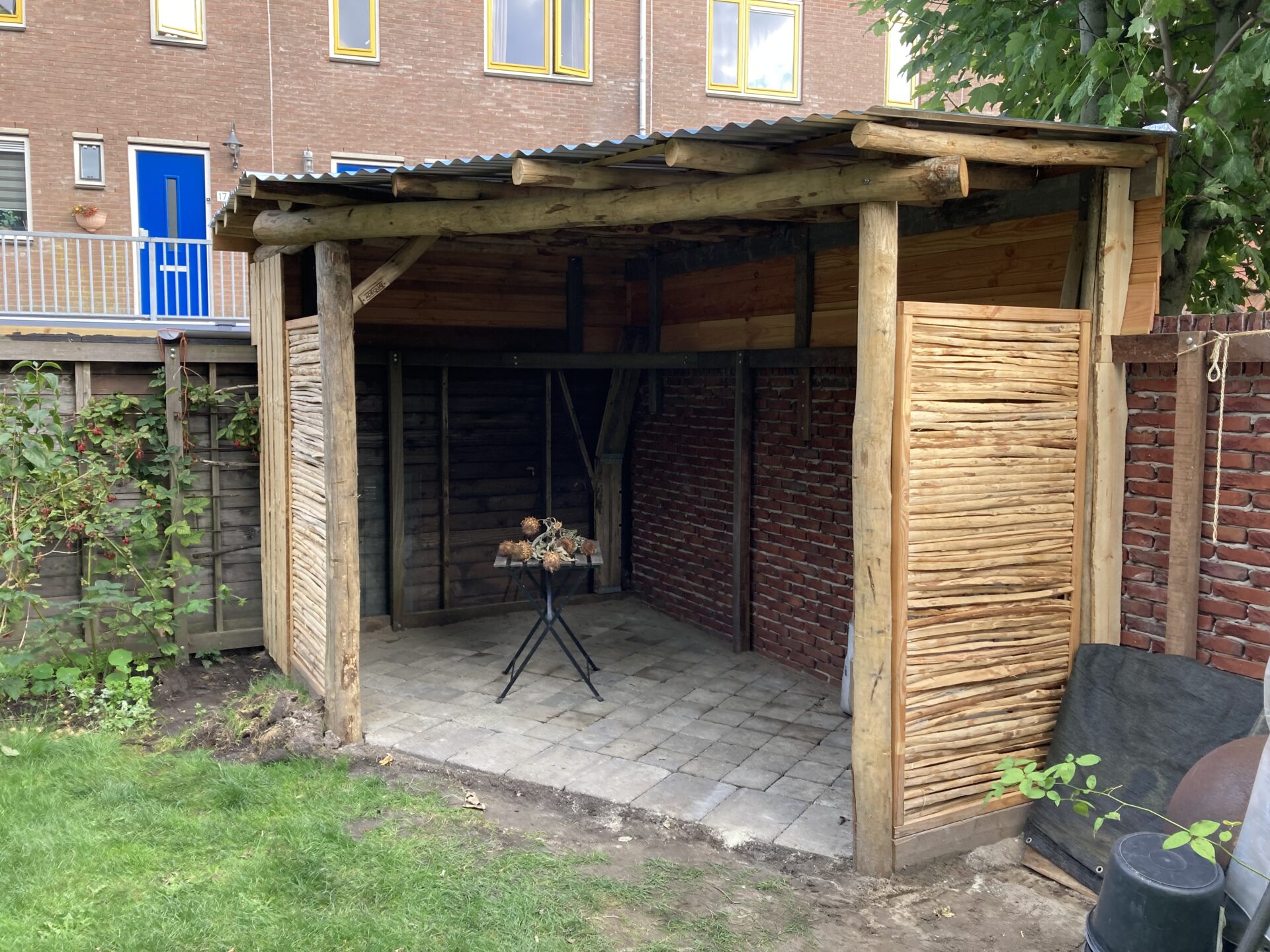 Met deze robinia-houten constructie hebben we onze hottub kunnen voorzien van een overkapping zodat hij ook in de wintermaanden in gebruik kan worden genomen. De robiniapalen passen heel goed in onze bostuin en ze zijn oerstevig!