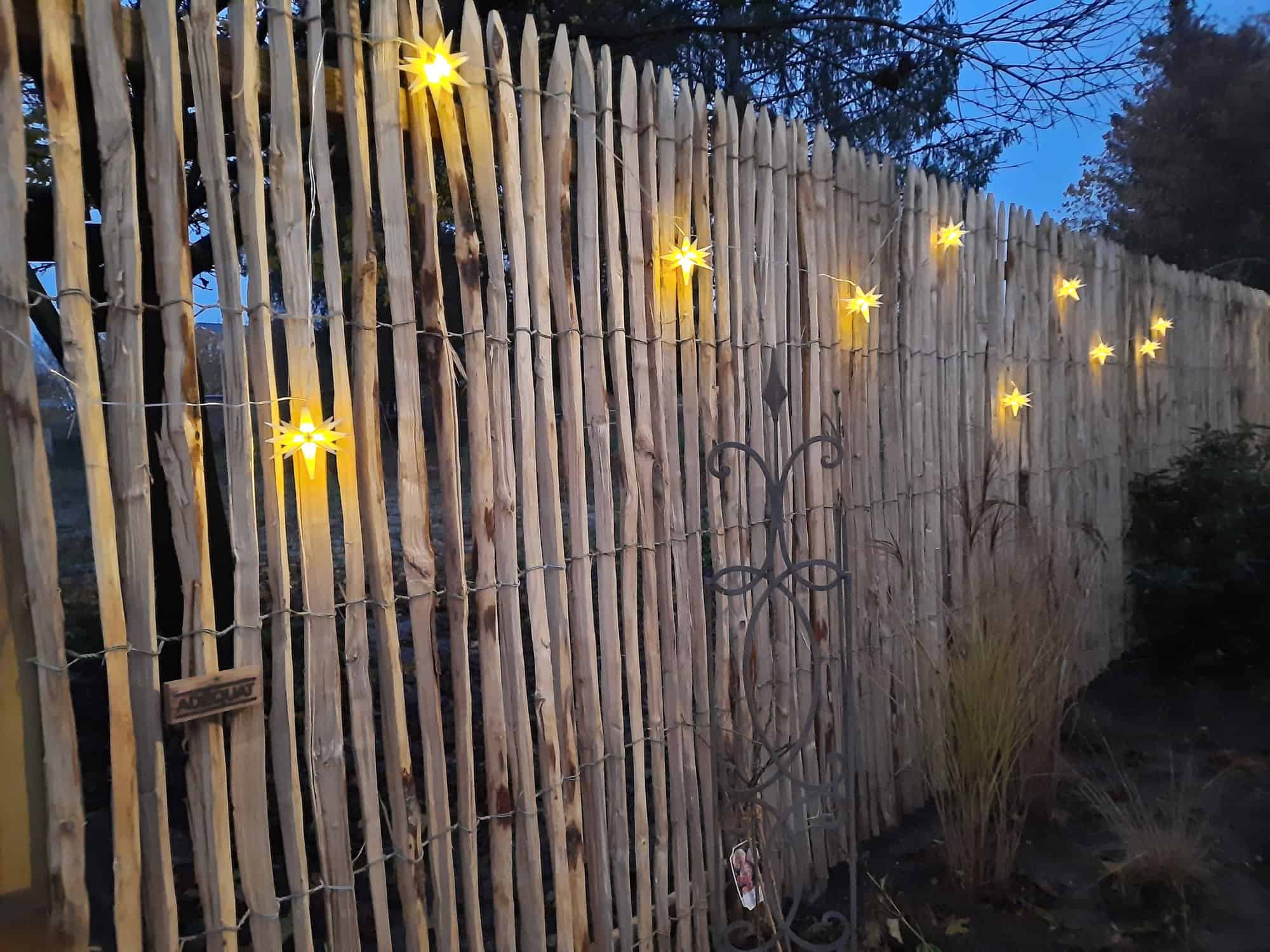 Onze kastanjehouten schapenhekken en rasterschermen zijn namelijk ideaal om lichtsnoeren aan te bevestigen. Wikkel de slinger eenvoudig om de latten; dankzij de structuur van het hek blijft hij vanzelf stevig zitten. Wilt u het lichtsnoer extra fixeren, dan volstaat een klein stukje binddraad.