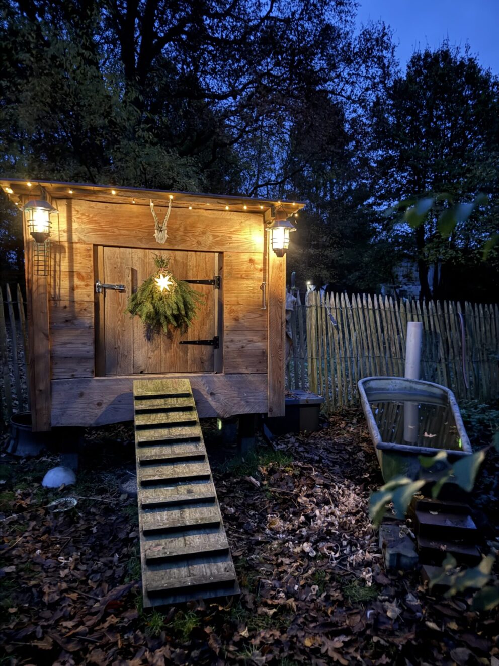 Lichtsnoeren zijn niet alleen leuk tijdens de kerst trouwens: in combinatie met de houten palen vormen ze een decoratief element voor het hele jaar. In de zomer zorgen ze voor een warme, uitnodigende sfeer en maken ze de tuin perfect voor ontspannen avonden met vrienden en familie onder de open hemel.