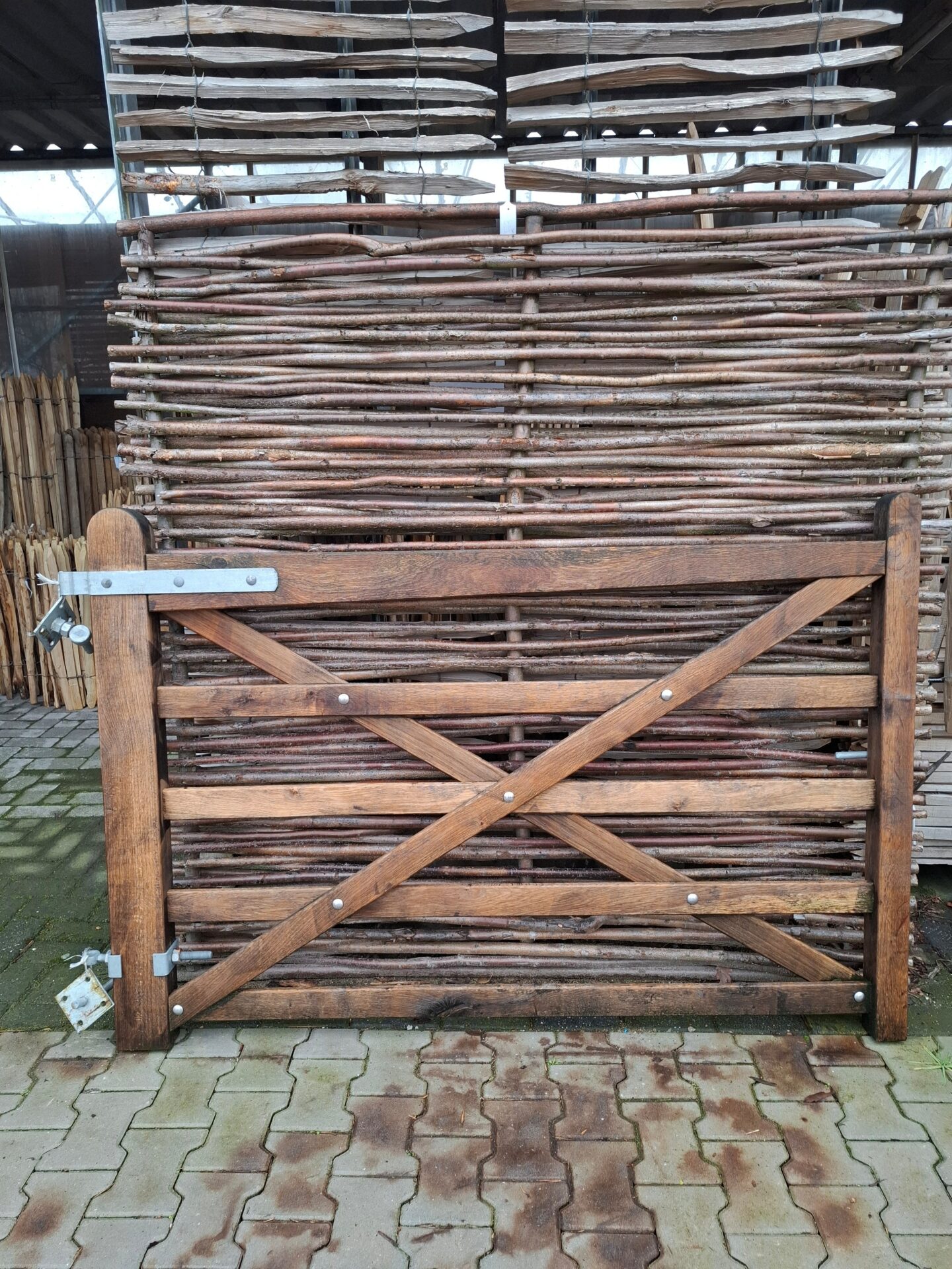 Nr 15 Engelse poort eiken enkel 120 cm H x 175 cm BR, linksdraaiend met grondpen.