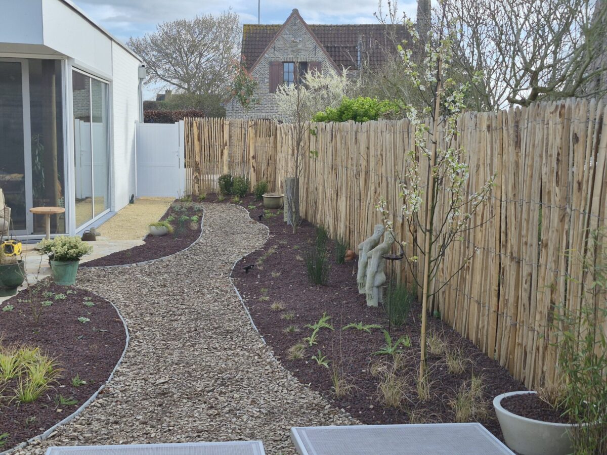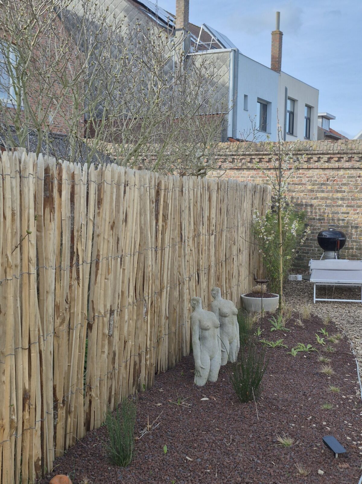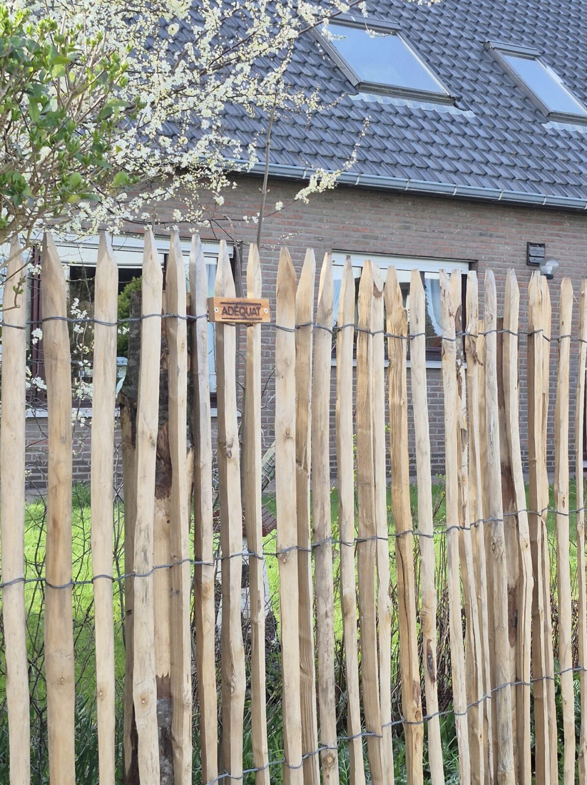 Zelf geplaatst hek. Na bekijken van de video’s goed te doen! Tussen de hogere palen wordt draad gespannen om een blauwe regen overheen te laten groeien.