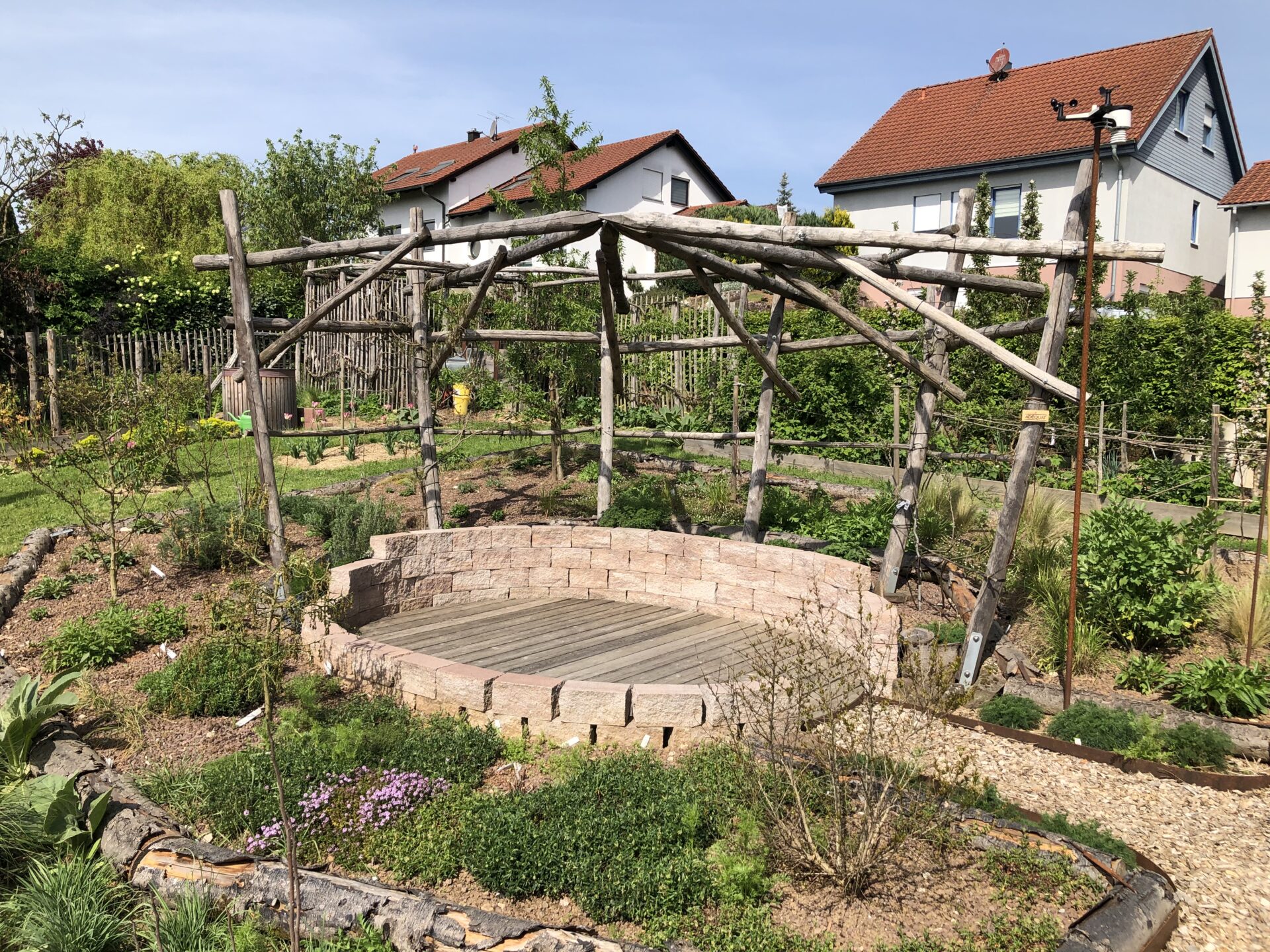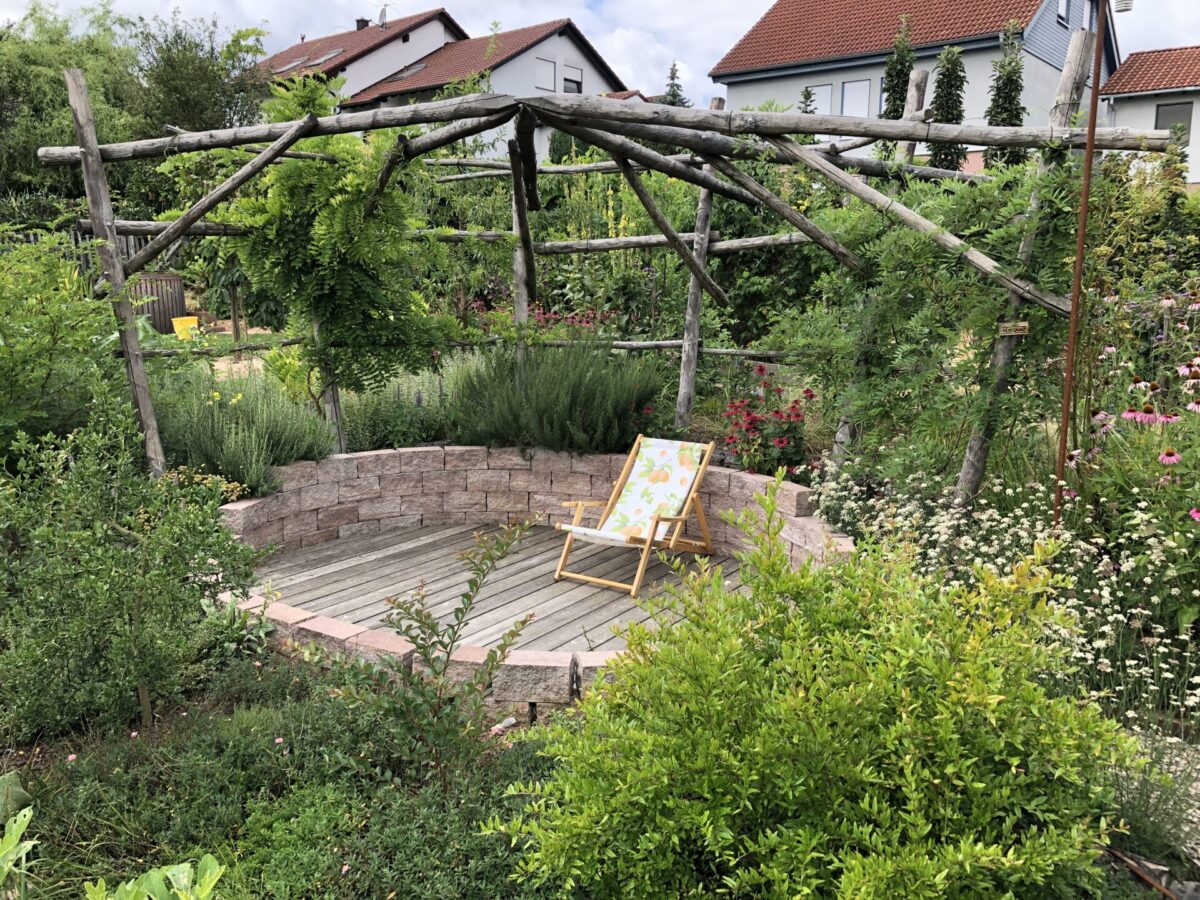 Bouw een ronde pergola rondom een boom en leg planken op de bovenste liggers: zo ontstaat er een platform op hoogte. In plaats van onder de pergola te zitten, bevindt de zithoek zich erboven en biedt het een unieke plek om te spelen, te loungen of gewoon te genieten van het uitzicht over de tuin. Vergeet de reling niet 😉
