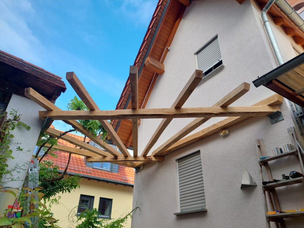 Een driekwart ronde pergola zorgt voor een gezellige, beschutte plek boven uw terras en past perfect in een beperkte ruimte bij een schuur of tussen twee gebouwen in. De balken worden meestal in een waaiervorm aangebracht tussen de muren, waardoor er een speels en luchtig dak ontstaat. Zo krijgt het geheel een prieelachtige sfeer: een intieme plek om te ontspannen, te lezen of samen te komen.