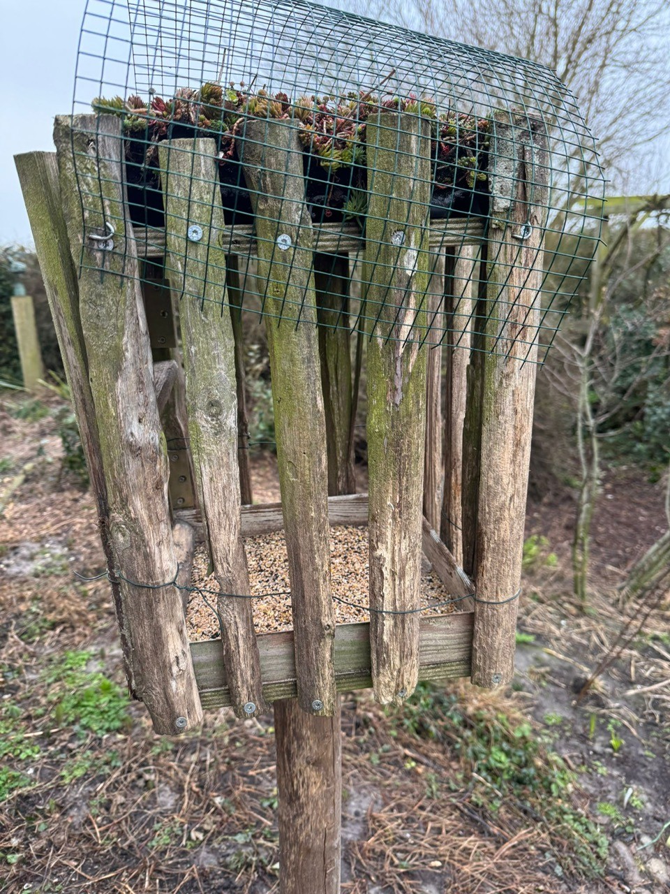In de schuur hadden ze nog een stuk schapenhek op rol liggen van hun hekwerk. Bert zag er meteen mogelijkheden in. Hij gebruikte het reststuk en maakte de latten van het schapenhek één voor één los. Die werden op maat gezaagd en zorgvuldig rondom een vierkant plateau vastgeschroefd met een dak erop, wat het voederhuis gelijk zijn kenmerkende “vogelkooi” uitstraling geeft.