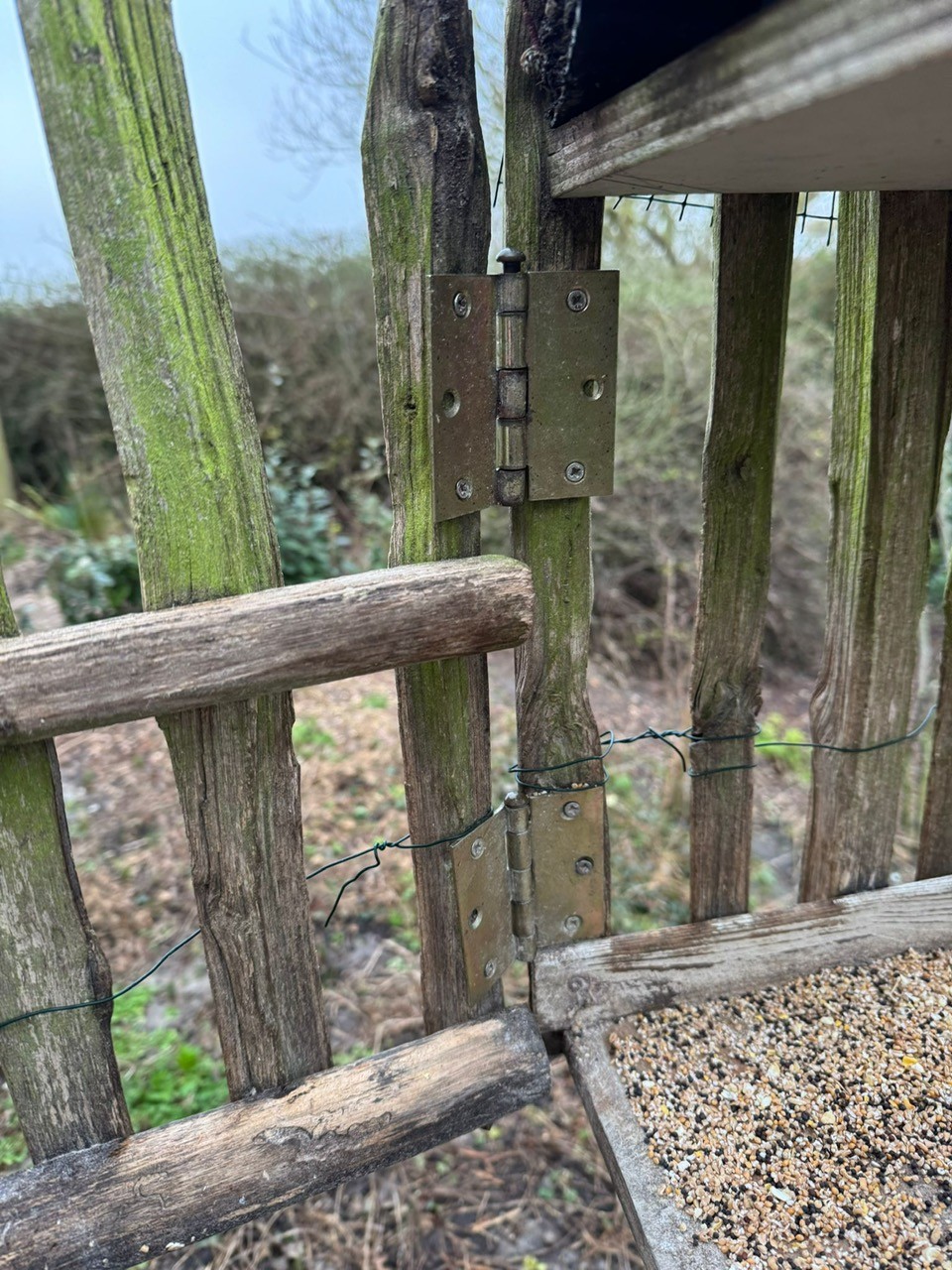 TIP bescherming tegen kraaien: Bert wikkelde een stukje ijzerdraad een paar centimeter boven het voederplateau (om de latten heen) om te voorkomen dat kraaien zich nog aan het plateau konden vasthouden.
