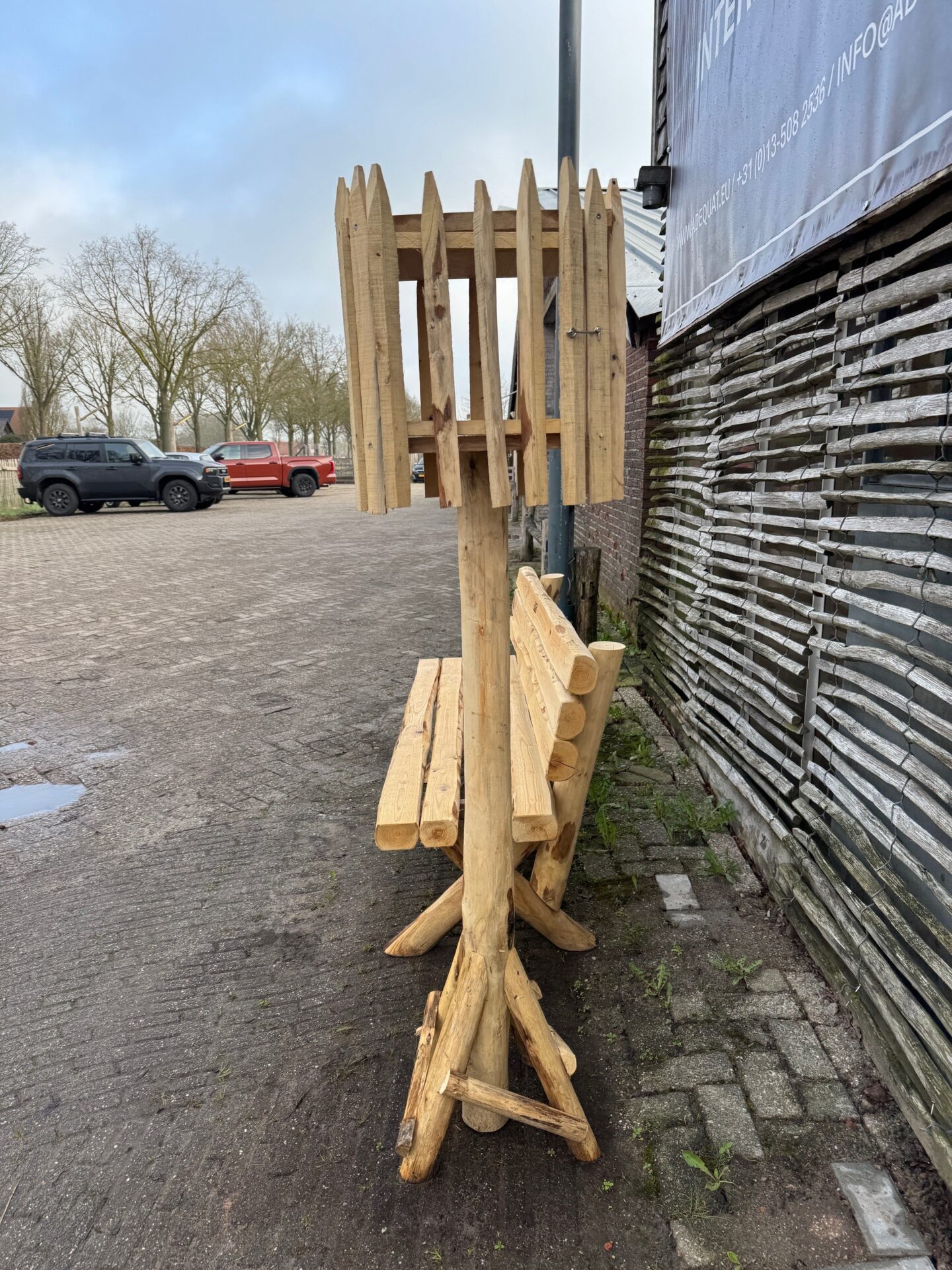 Geïnspireerd door het voederhuis van Bert en Lisette, maakte onze collega Ton een eigen losstaande versie ter inspiratie en om te laten zie hoe een model op voet eruit ziet. Hij gebruikte de rasterlatten van kastanjehout en maakte een plateau en een dak uit 2 eiken platen die in onze werkplaats op maat werden gezaagd. Eiken en kastanjehout hebben een gelijke kleur en vergrijzen op dezelfde manier. Uiteindelijk zal het hout dezelfde kleur krijgen als het exemplaar van Bert en Lisette.