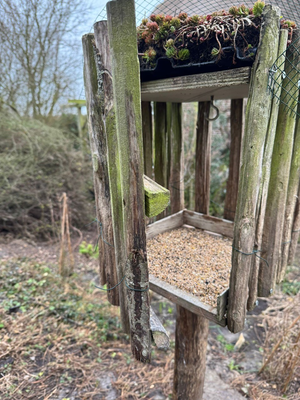 Het vogelhuis, dat ook een handig deurtje kreeg om makkelijk het voer bij te kunnen vullen, werd op een stevige paal geplaatst en het dak kreeg zelfs nog een restje overgebleven sedum van het groendak. Alles werd dus hergebruikt!