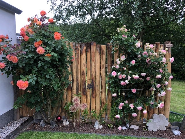- Klimroos (Rosa sp.): maakt lange, buigzame takken die u horizontaal of schuin kunt leiden. Ze klimmen niet zelf, maar bloeien rijk als u ze goed vastbindt.