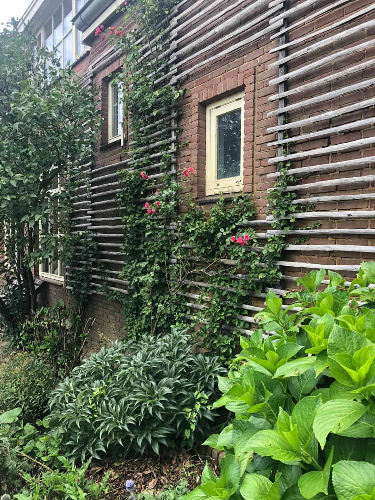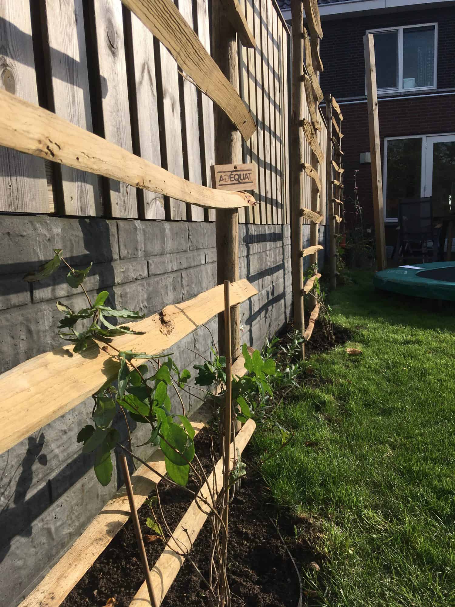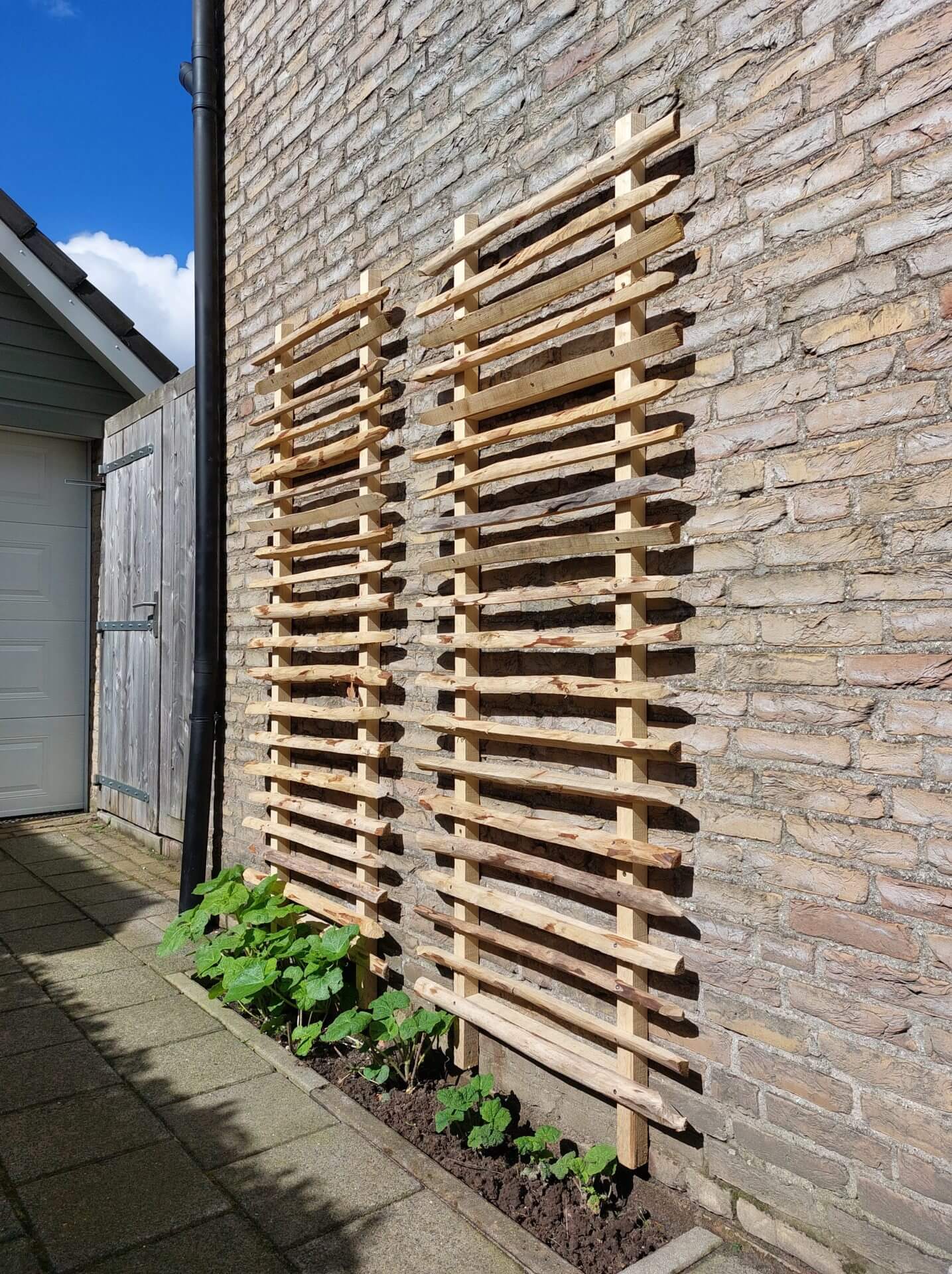 Wilt u uw gevel liever wat ontzien? Dan kunt u, net als onze klanten hieronder dat deden, kastanjehouten klimrekken tegen de gevels maken. Daarmee krijgen de klimplanten iets om zich aan vast te houden, zonder zich volledig aan uw gevel te hechten. Zo geniet u van hetzelfde groene effect, maar met extra bescherming voor uw muur; de ideale combinatie van praktisch en mooi!